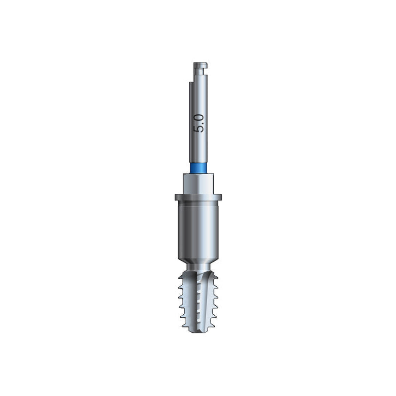 For the placement of Glidewell HT Implants in extremely dense bone, it may be necessary to utilize a thread-forming screw tap corresponding to the diameter of the implant body. Due to the tap design and implant cutting efficiency, one tap is used for multiple implant lengths. The coronal head of each screw tap is slightly flared, resulting in a gentle expansion of the cortical plate for receiving the wider neck of the implant.