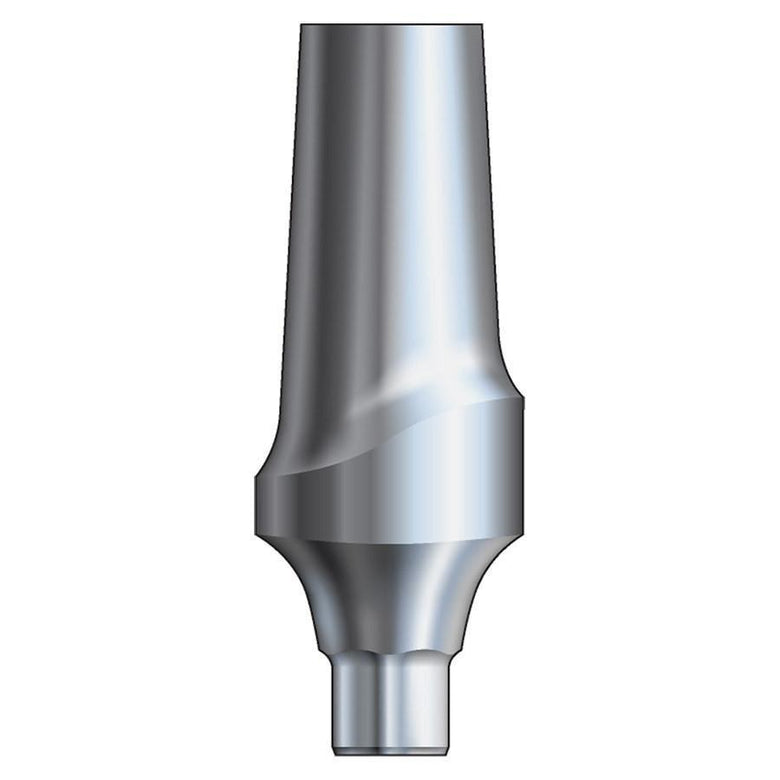 Glidewell HT™ Implant Esthetic Abutments are prefabricated, screw-retained intraoral abutments intended to be connected directly to an endosseous implant for retention of a cemented dental prosthesis. They may be indicated for single- and multiple-tooth restorations. Esthetic abutments are precisely machined from titanium alloy and attached to the implant fixture with a titanium screw. Unlike the circular emergence profile of standard stock abutments, esthetic abutments are manufactured with a tapered emergence profile for more natural-looking contouring of the soft tissue at the implant site. Each esthetic abutment is specific to the restorative platform of the seated implant, and anatomically designed for the connection site’s region on the ridge (anterior or posterior). In addition to the standard, straight abutment body, angled abutment bodies, produced with a 15 degree slope of one hemisphere to compensate for an undesirable path of insertion resulting from excessive implant angulation, are available.