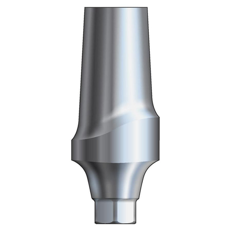 Glidewell HT™ Implant Esthetic Abutments are prefabricated, screw-retained intraoral abutments intended to be connected directly to an endosseous implant for retention of a cemented dental prosthesis. They may be indicated for single- and multiple-tooth restorations. Esthetic abutments are precisely machined from titanium alloy and attached to the implant fixture with a titanium screw. Unlike the circular emergence profile of standard stock abutments, esthetic abutments are manufactured with a tapered emergence profile for more natural-looking contouring of the soft tissue at the implant site. Each esthetic abutment is specific to the restorative platform of the seated implant, and anatomically designed for the connection site’s region on the ridge (anterior or posterior). In addition to the standard, straight abutment body, angled abutment bodies, produced with a 15 degree slope of one hemisphere to compensate for an undesirable path of insertion resulting from excessive implant angulation, are available.