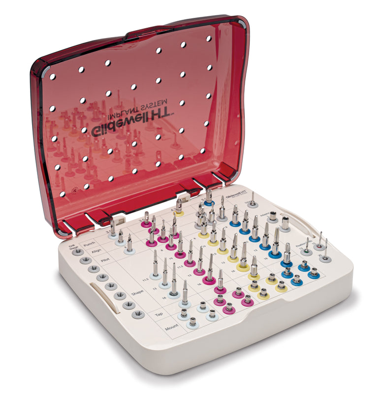The guided surgical kit allows the clinician to easily organize, store, and transport the instrumentation components of the Glidewell HT Implant Guided Surgery System. Drills are arranged from left to right in order of increasing diameter, following the recommended drilling sequence. Color coding indicates the corresponding diameter of the Glidewell HT Implant, and each drill includes laser etching that indicates the diameter and length.