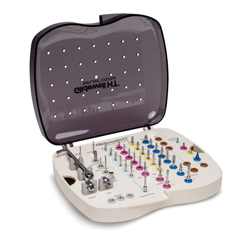 The Glidewell HT™ Implant System is easy to use, with a streamlined surgical protocol, length-specific drills, and new and improved surgical kits based on eight years of clinical feedback. The surgical kit allows the clinician to easily organize, store, and transport the instrumentation components of the Glidewell HT Implant System. Drills are arranged from left to right in order of increasing diameter, following the recommended drilling sequence. Color coding indicates the corresponding diameter of the Glidewell HT Implant, and each drill includes laser etching that indicates the diameter and length.