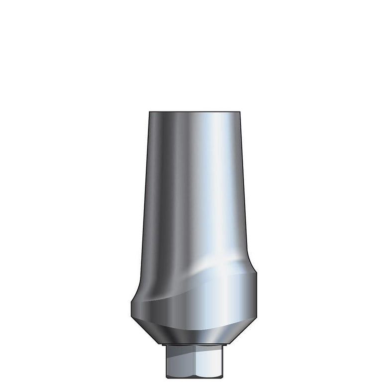 Inclusive Titanium Esthetic Abutments are prefabricated, screw-retained intraoral abutments intended to be connected directly to an endosseous implant for retention of a cemented dental prosthesis. They may be indicated for single- and multiple-tooth restorations. Titanium esthetic abutments are precisely machined from titanium alloy and packaged NON-STERILE. They are attached to the implant fixture with a titanium screw. Unlike the circular emergence profile of standard stock abutments, esthetic abutments are manufactured with a tapered emergence profile for more natural-looking contouring of the soft tissue at the implant site. Each esthetic abutment is specific to the restorative platform of the seated implant, and anatomically designed for the connection site’s region on the ridge (anterior or posterior). In addition to the standard, straight abutment body, angled abutment bodies, produced with a 15 degree slope of one hemisphere to compensate for an undesirable path of insertion resulting from excessive implant angulation, are available.