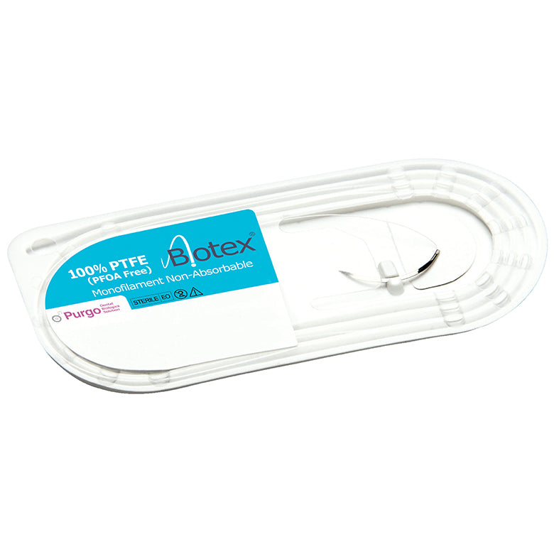 Biotex™ PTFE Sutures comprise a non-resorbable monofilament PTFE suture connected to a stainless-steel, reverse-cutting surgical needle. The material and construction of the suture provide reliable stability over time, as well as lower accumulation of bacterial plaque for improved healing of soft tissue due to the nonwicking quality of the monofilament thread. Biotex PTFE sutures are packaged in 10-packs and are indicated for use in dental soft tissue approximation and/or ligation. Other advantages of this product include: