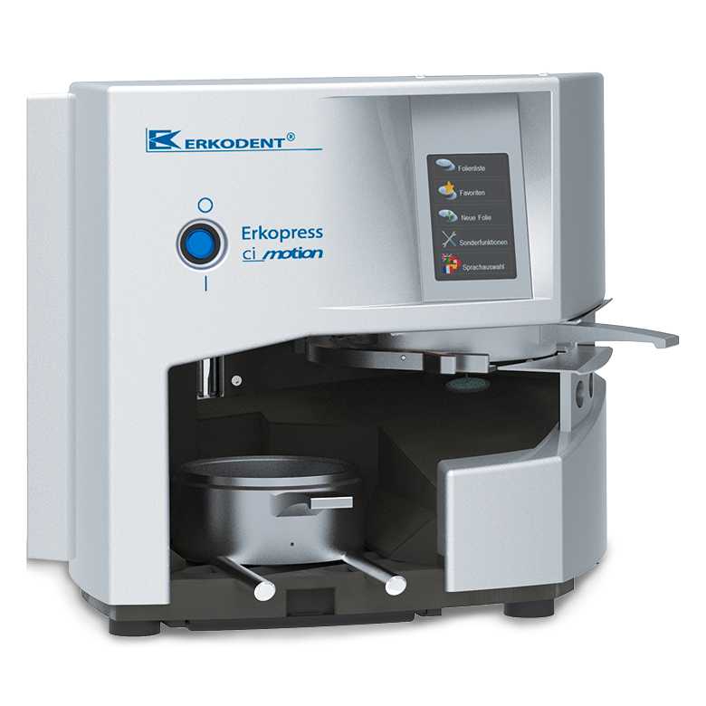 While featuring the familiar touchless temperature sensor and touch panel display with preprogrammed settings, the Erkopress ci motion improves upon earlier models by automating the thermoforming process: After the foil is heated to the appropriate temperature, the foil is automatically placed onto the model, starting the thermoforming process.